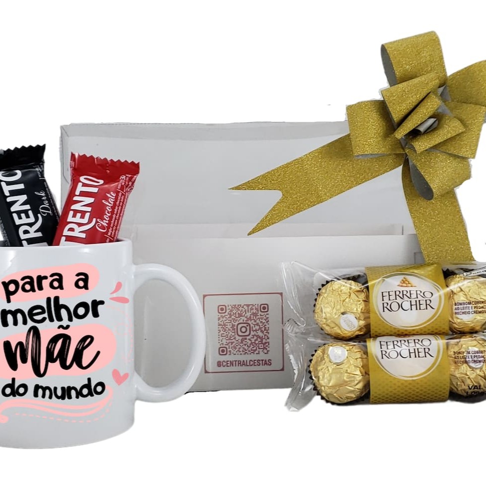 Box caneca Qtd: Item 1 - Caneca melhor Mãe 320ml 2 - Trento - 32g 2 - Ferrero T3 - 37,5g 1 - Cartão de Mensagem 1 - Caixa Box (22x15,5x9cm) 1 - Laço Total de 8 itens.