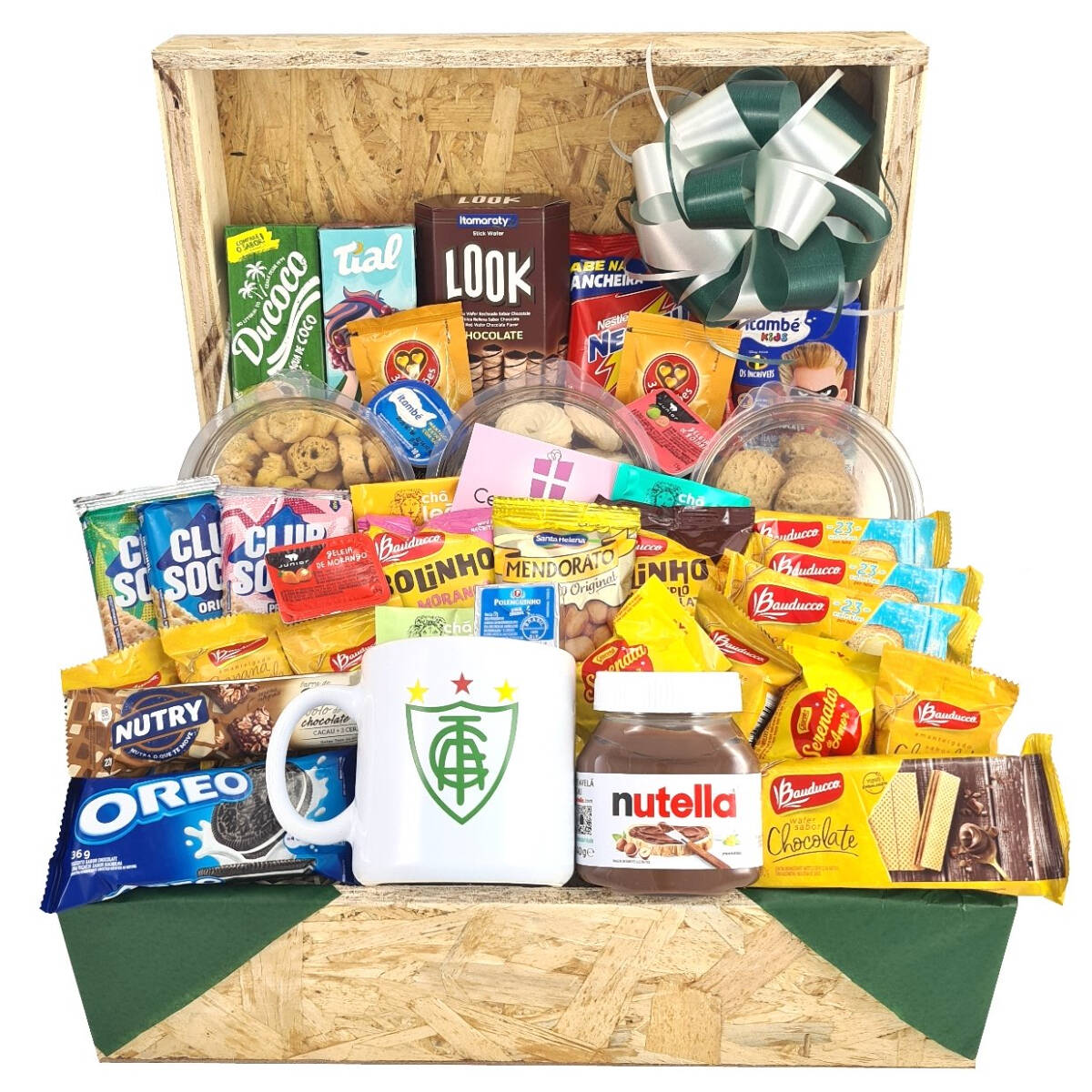 Baú de Time – América Conteúdo: 1 Kit Do América 1 Achocolatado 200ml 1 Água De Coco 200ml 1 Suco De Uva 200ml 1 Mini-Amendoin Japonês 27g 1 Torradinha Caseira (60g) 1 Biscoito Fino De Coco (80g) 1 Biscoito Fino Cookie (100g) 1 Bolinho De Chocolate Bauducco 40g 1 Bolinho De Baunilha Com Morango Bauducco 40g 3 Torrada Salgada Bauducco 15g 2 Biscoito Amanteigado De Leite Bauducco 11,5g 2 Biscoito Amanteigado De Chocolate Bauducco 11,5g 2 Biscoito Amanteigado De Banana E Canela Bauducco 11,5g 1 Mini-Wafer Bauducco 40g 1 Biscoito Recheado Oreo 36g 3 Biscoito Clube Social 26g 1 Cereal Matinal (Sucrilhos Kelloggs Ou Nestlé) 25g 1 Palito De Chocolate Look 55g 1 Barra De Cereal Nutry 25g 1 Creme De Avelã Nutela 140g 3 Bombom Sonho de Valsa 20g 1 Capuccino Chocolate – Três Corações 10g 1 Capuccino Tradicional – Três Corações 10g 3 Sache De Chá – 2g 2 Sache De Açucar 2 Sache De Adoçante 3 Geleinha 15g 2 Manteiguinha 10g 2 Melzinho 15g 1 Queijo Polenguinho 17g 1 Baú De Madeira (M) 1 Cartão De Mensagem Total de 50 Itens. Obs.: Na falta de um dos itens acima o mesmo será substituído por outro de igual padrão e qualidade.