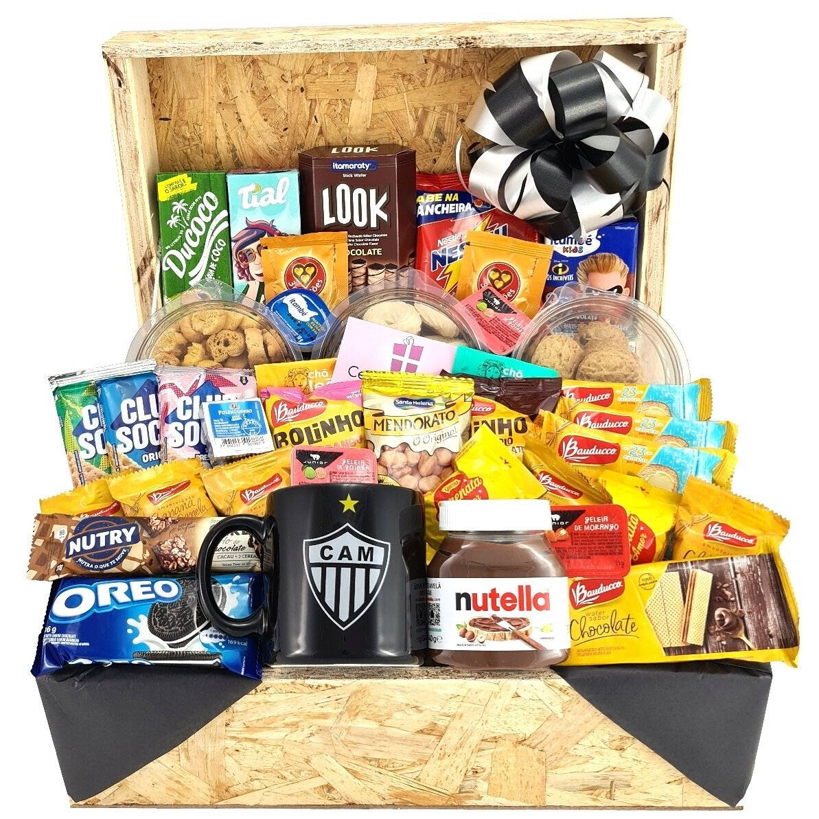 Baú de Time – Atlético Conteúdo: 1 Kit Do Atlético 1 Achocolatado 200ml 1 Água De Coco 200ml 1 Suco De Uva 200ml 1 Mini-Amendoin Japonês 27g 1 Torradinha Caseira (60g) 1 Biscoito Fino De Coco (80g) 1 Biscoito Fino Cookie (100g) 1 Bolinho De Chocolate Bauducco 40g 1 Bolinho De Baunilha Com Morango Bauducco 40g 3 Torrada Salgada Bauducco 15g 2 Biscoito Amanteigado De Leite Bauducco 11,5g 2 Biscoito Amanteigado De Chocolate Bauducco 11,5g 2 Biscoito Amanteigado De Banana E Canela Bauducco 11,5g 1 Mini-Wafer Bauducco 40g 1 Biscoito Recheado Oreo 36g 3 Biscoito Clube Social 26g 1 Cereal Matinal (Sucrilhos Kelloggs Ou Nestlé) 25g 1 Palito De Chocolate Look 55g 1 Barra De Cereal Nutry 25g 1 Creme De Avelã Nutela 140g 3 Bombom Sonho de Valsa 20g 1 Capuccino Chocolate – Três Corações 10g 1 Capuccino Tradicional – Três Corações 10g 3 Sache De Chá – 2g 2 Sache De Açucar 2 Sache De Adoçante 3 Geleinha 15g 2 Manteiguinha 10g 2 Melzinho 15g 1 Queijo Polenguinho 17g 1 Baú De Madeira (M) 1 Cartão De Mensagem Total de 50 Itens. Obs.: Na falta de um dos itens acima o mesmo será substituído por outro de igual padrão e qualidade.