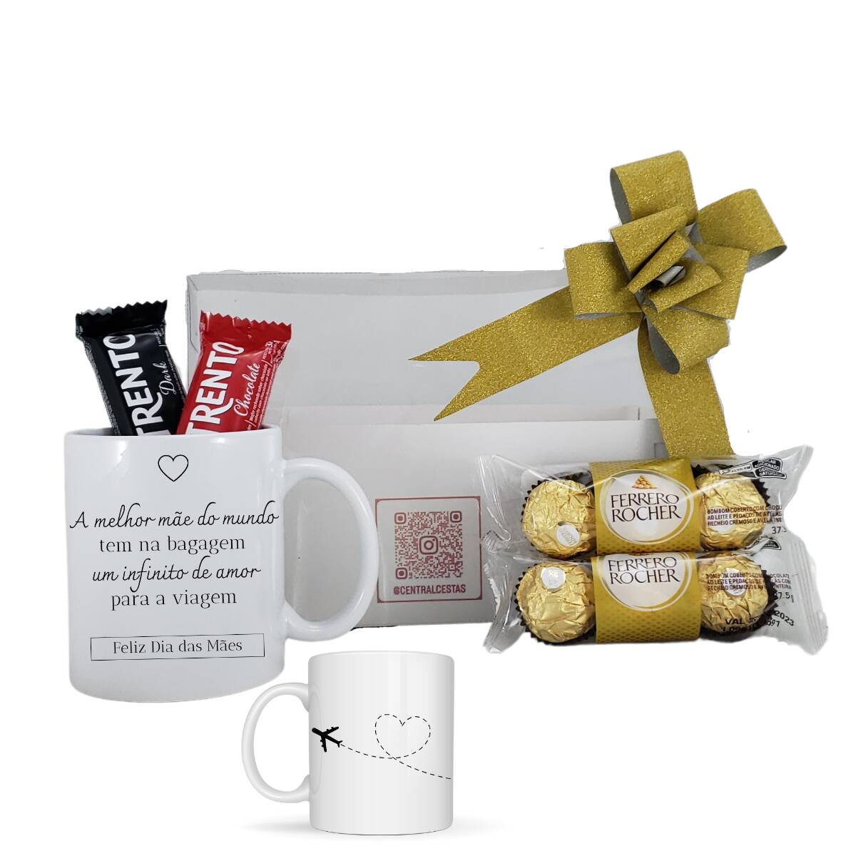 Box caneca A melhor Mãe do mundo tem na bagagem um Infinito de amor para a viagem. Qtd: Item 1 - Caneca 320ml 2 - Trento - 32g 2 - Ferrero T3 - 37,5g 1 - Cartão de Mensagem 1 - Caixa Box (22x15,5x9cm) 1 - Laço Total de 8 itens.