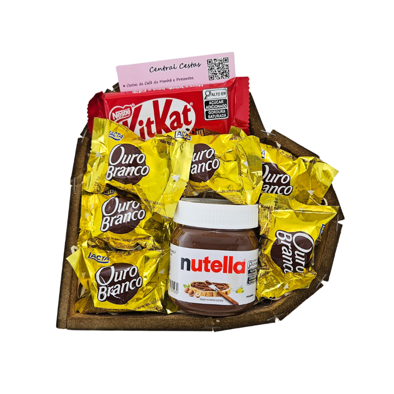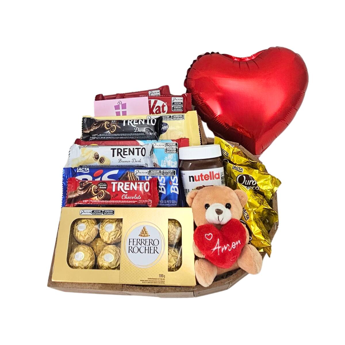 Cc82 Coração De Amor Qtd Item 1 CREME DE AVELÃ – NUTELLA 140g 1 CAIXA DE BIS – 100g 1 FERRERO ROCHER T8 – 100g 4 BOMBOM OURO BRANCO – 20g 2 KITKAT – NESTLÉ 41,5g 1 BARRA DE CHOCOLATE CLASSIC – NESTLÉ 80g 1 BARRA DE CHOCOLATE LAKA – NESTLÉ 80g 1 TRENTO – 29g 1 TRENTO DARK 29g 1 TRENTO BRANCO 29g 1 CHAVEIRO URSINHO COM CORAÇÃO (PP) 1 BALÃO METALIZADO 9″ – CORAÇÃO 1 CORAÇÃO DE MADEIRA (G) 1 CARTÃO DE MENSAGEM TOTAL DE 18 ITENS Obs.: Na falta de um dos itens acima o mesmo será substituído por outro de igual padrão e qualidade ___#Cesta #Petisco #Drinks #Presente #Doce #Salgadinho #Café #Manhã #Chocolate #Bombom #Nutella