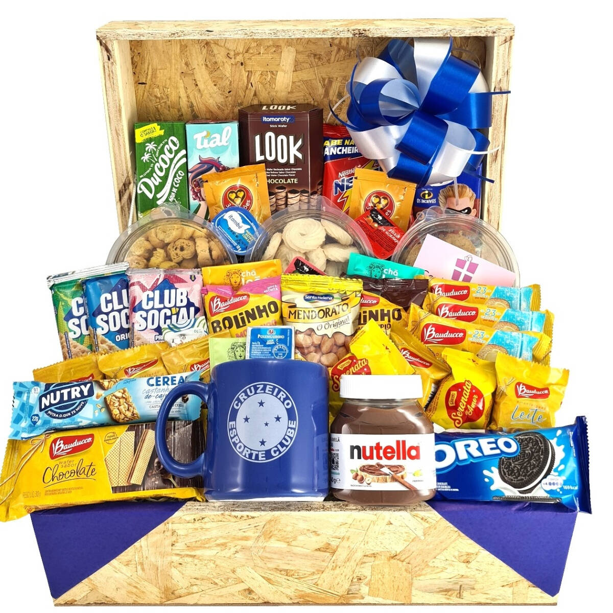 Baú de Time – Cruzeiro Conteúdo: 1 Kit Do Cruzeiro 1 Achocolatado 200ml 1 Água De Coco 200ml 1 Suco De Uva 200ml 1 Mini-Amendoin Japonês 27g 1 Torradinha Caseira (60g) 1 Biscoito Fino De Coco (80g) 1 Biscoito Fino Cookie (100g) 1 Bolinho De Chocolate Bauducco 40g 1 Bolinho De Baunilha Com Morango Bauducco 40g 3 Torrada Salgada Bauducco 15g 2 Biscoito Amanteigado De Leite Bauducco 11,5g 2 Biscoito Amanteigado De Chocolate Bauducco 11,5g 2 Biscoito Amanteigado De Banana E Canela Bauducco 11,5g 1 Mini-Wafer Bauducco 40g 1 Biscoito Recheado Oreo 36g 3 Biscoito Clube Social 26g 1 Cereal Matinal (Sucrilhos Kelloggs Ou Nestlé) 25g 1 Palito De Chocolate Look 55g 1 Barra De Cereal Nutry 25g 1 Creme De Avelã Nutela 140g 3 Bombom Sonho de Valsa 20g 1 Capuccino Chocolate – Três Corações 10g 1 Capuccino Tradicional – Três Corações 10g 3 Sache De Chá – 2g 2 Sache De Açucar 2 Sache De Adoçante 3 Geleinha 15g 2 Manteiguinha 10g 2 Melzinho 15g 1 Queijo Polenguinho 17g 1 Baú De Madeira (M) 1 Cartão De Mensagem Total de 50 Itens. Obs.: Na falta de um dos itens acima o mesmo será substituído por outro de igual padrão e qualidade.