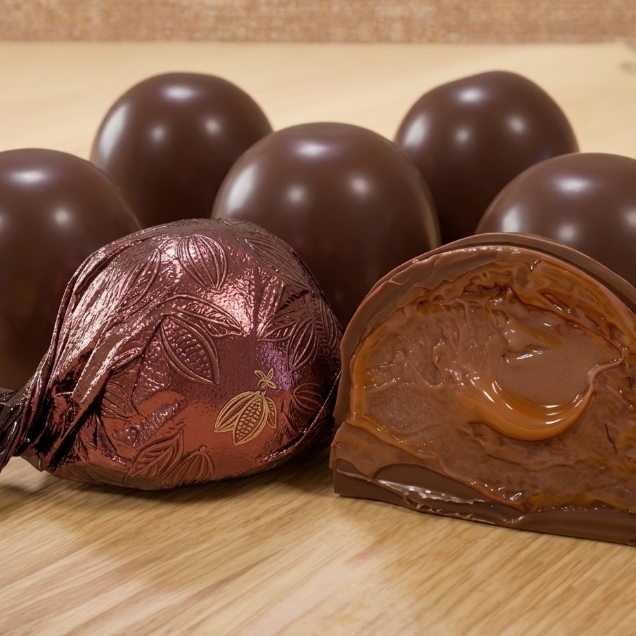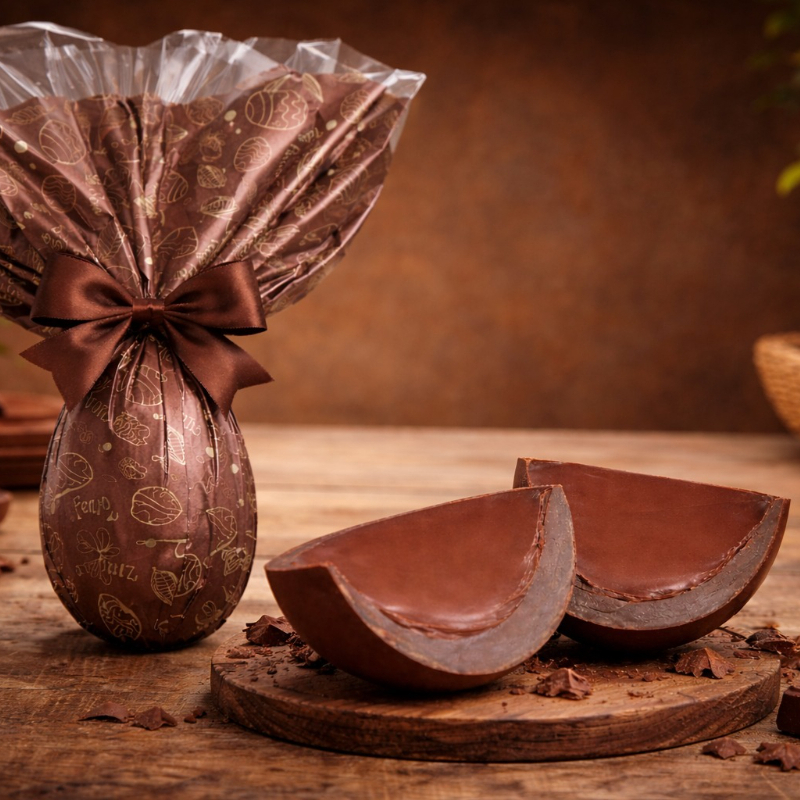 Delicioso ovo de Páscoa Artesanal com casca de chocolate recheada de brigadeiro cremoso, com textura macia e sabor intenso de chocolate.