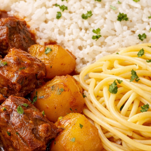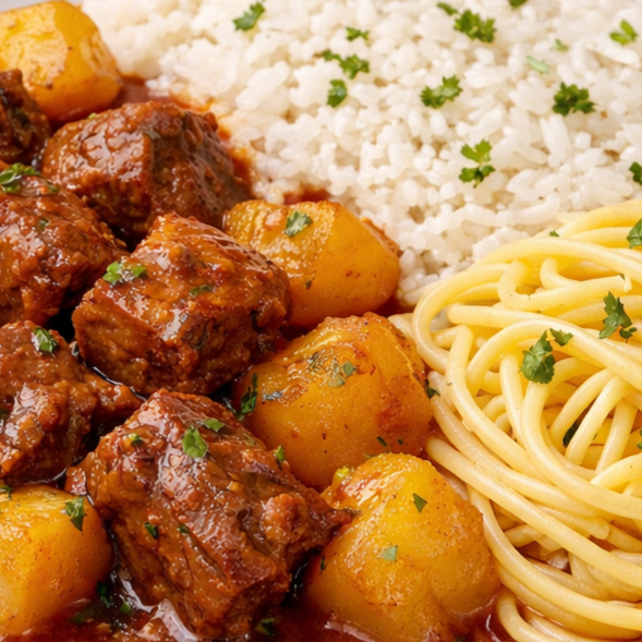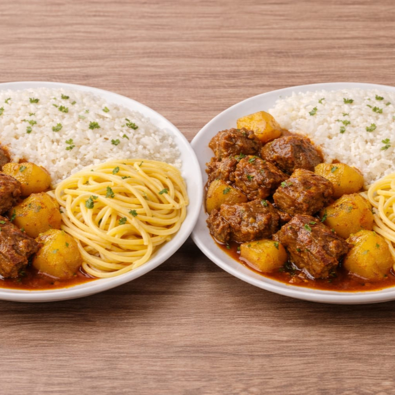 Carne macia cozida lentamente no molho tradicional, acompanhada de batatas bem cozidas e saborosas. Uma refeição caseira, simples e cheia de sabor, perfeita para o Dia a Dia. No prato vem: Arroz, carne cozida com batatas, macarrão e salada.