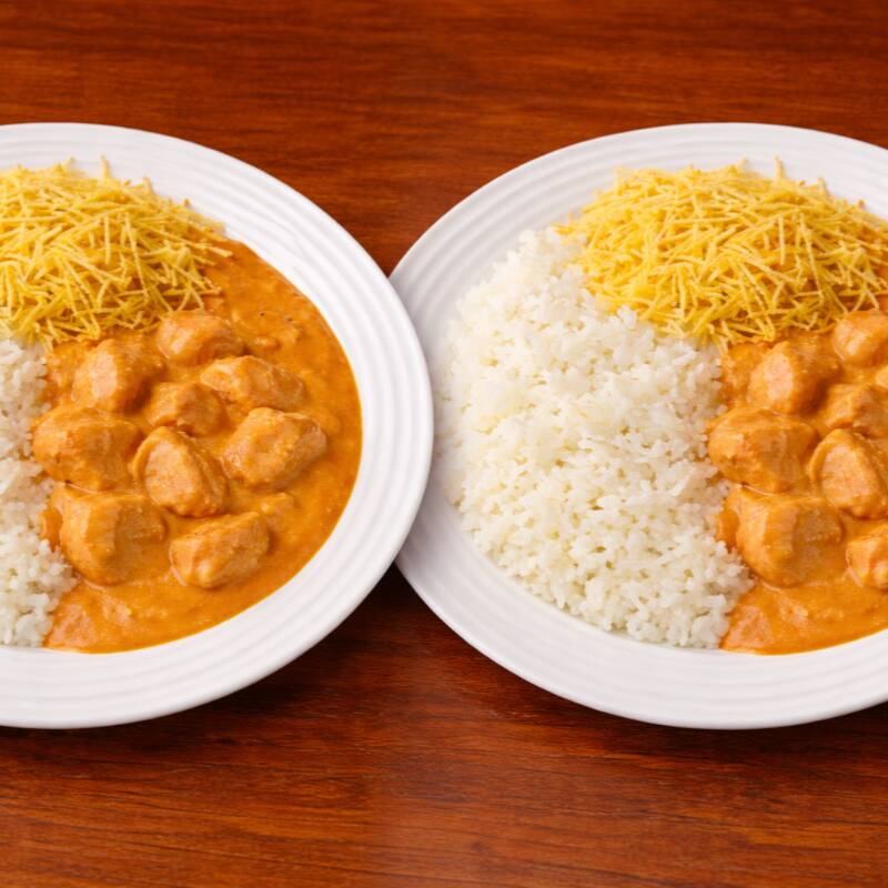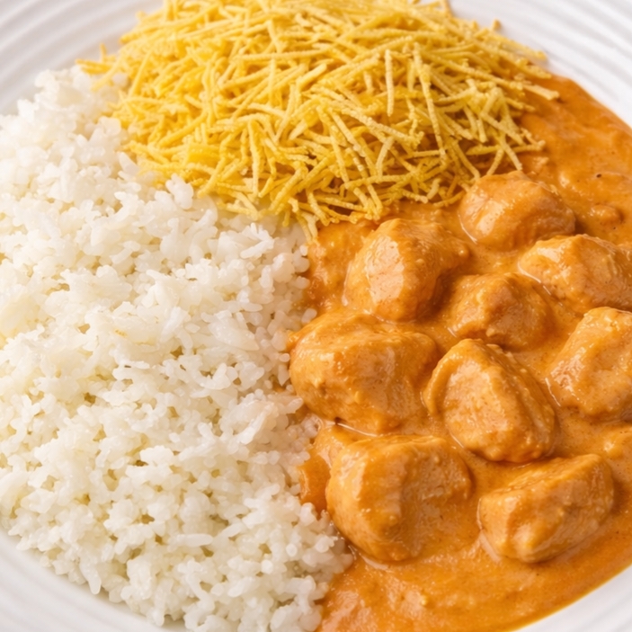Frango macio no molho cremoso de strogonoff, servido com arroz branco soltinho. A batata palha vai em potinho separado para chegar sempre crocante.