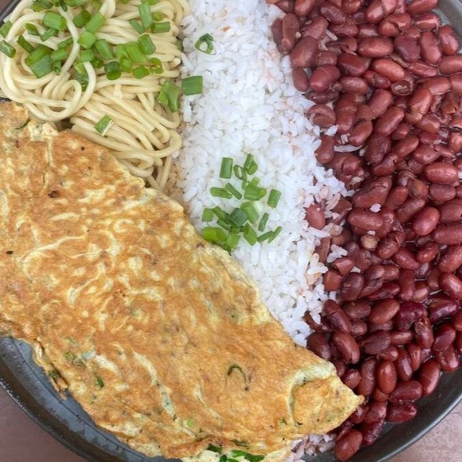 Delicioso Omelete de Queijo e Ervas, Acompanhado de Arroz Branco, Feijão Carioca e Espaguete Alho e Óleo.