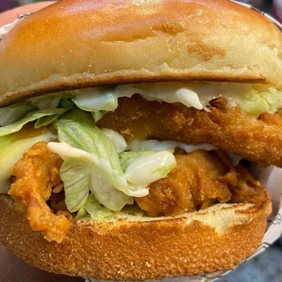 Pão Brioche Selado na Chapa, Tiras de Frango Crocante, Queijo Mussarela, Maionese Temperada e Salada.