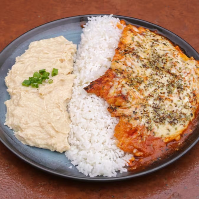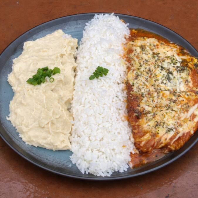 Arroz Branco, Bife de Frango com Queijo e Molho de Tomate, Purê de Batata e Salada do Dia.