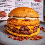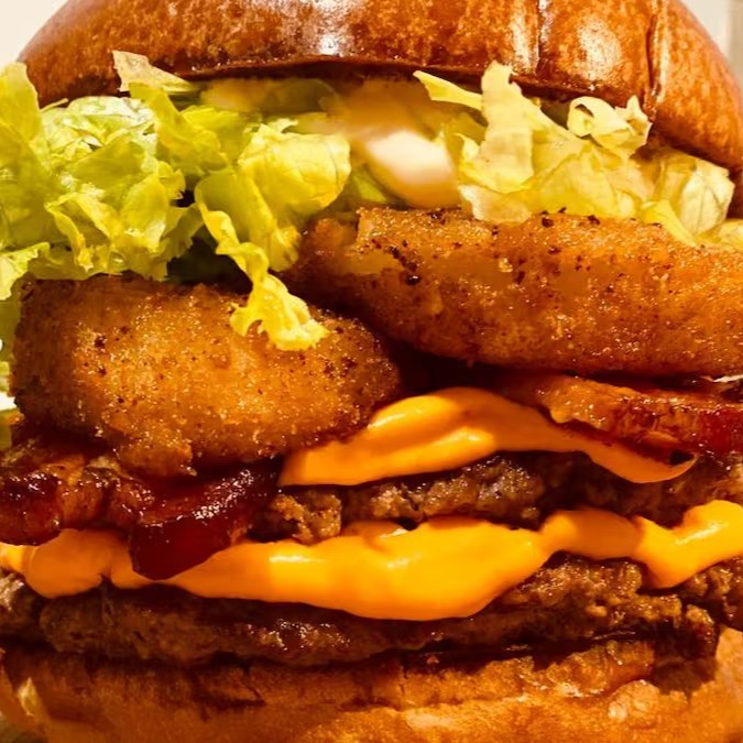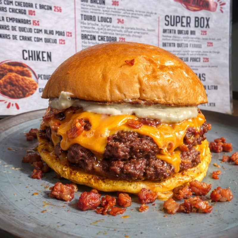 Pão Brioche Selado na Chapa, Dois Hambúrgueres de 120g, Generosa Porção de Bacon Crocante, Queijo Cheddar Cremoso, Alface Americano, Onion Rings Artesanal e Maionese Temperada.