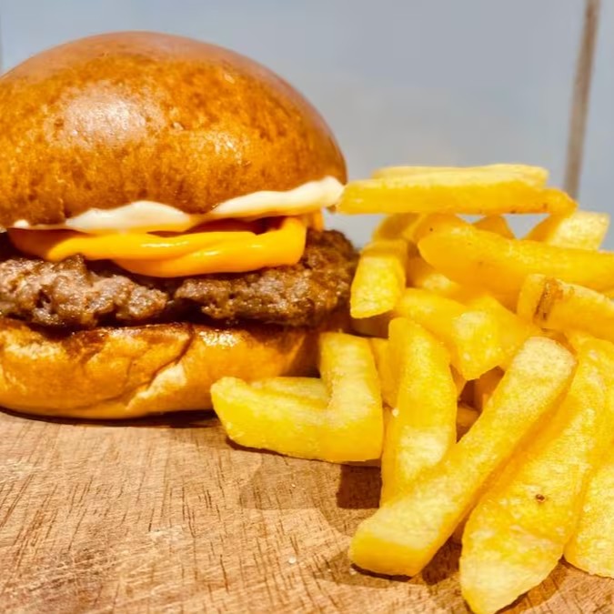 Pão Brioche Selado na Chapa, Hambúrguer Artesanal de 100g, Queijo Cheddar e Maionese Temperada.