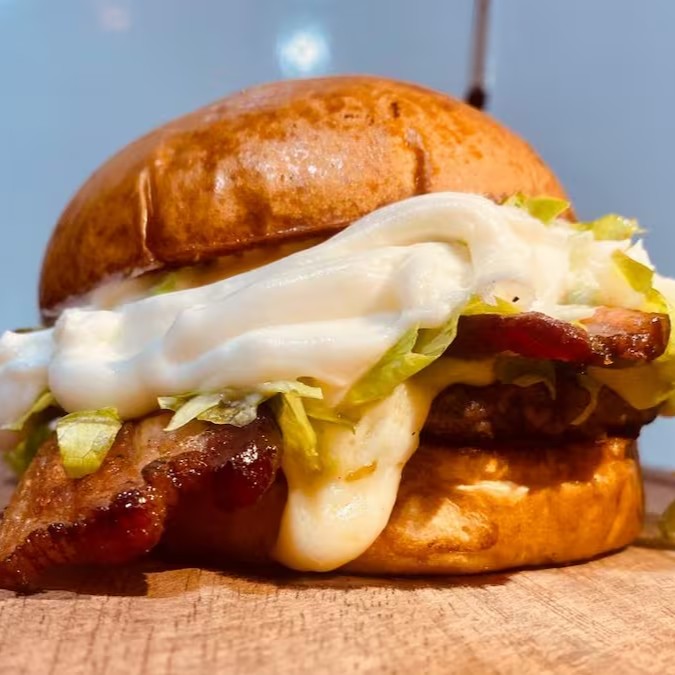 Pão Brioche Selado na Chapa, Hambúrguer Artesanal de 120g, Generosa Porção de Bacon Crocante, Queijo Mussarela Derretido, Alface Americano e Sensacional Maionese Temperada da Casa.