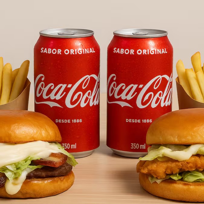Combo Duplo Clássico — Dois Hambúrgueres Artesanais à Sua Escolha, Acompanhados de Duas Porções de Batata Frita Crocante e Duas Coca-Cola 350ml Bem Geladas.