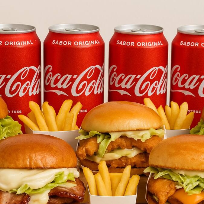 Combo Triplo — Três Hambúrgueres Artesanais à Sua Escolha, Acompanhados de Três Porções de Batata Frita Crocante e Três Coca-Cola 350ml Bem Geladas.