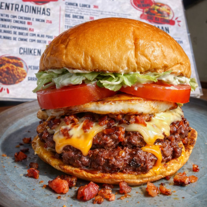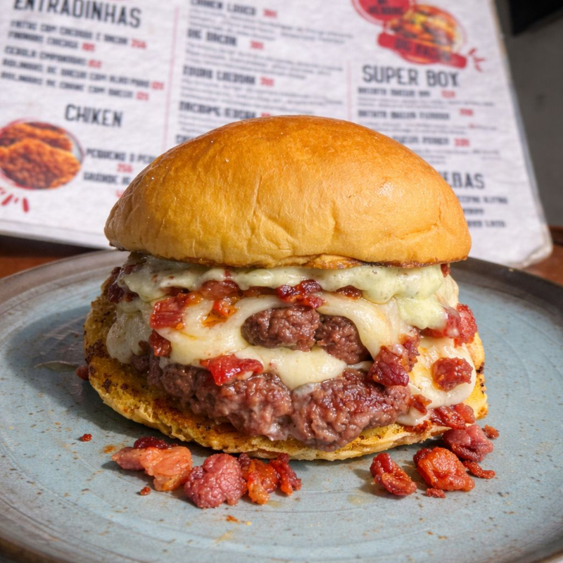 Pão Brioche Selado na Chapa, Dois Hambúrgueres Artesanais de 120g Cada, Bacon Crocante, Queijo Empanado e Alface Americano.