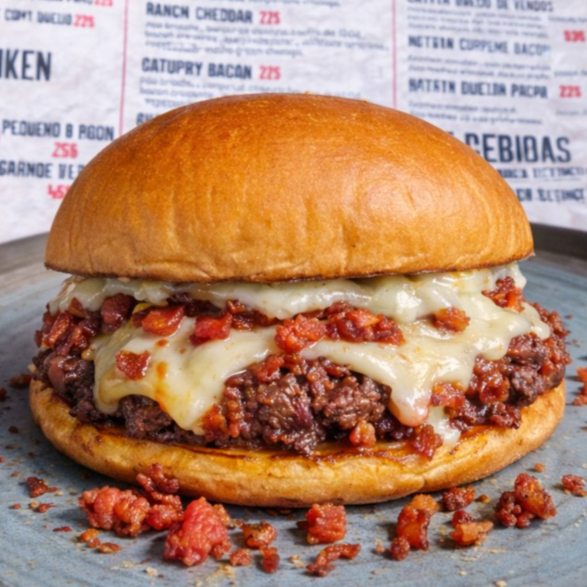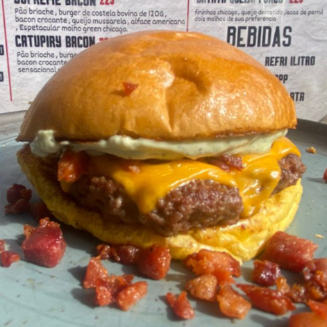 Pão Brioche Selado na Chapa, Hambúrguer de 120g, Bacon em Cubos, Catupiry Cremoso, Alface Americano e Maionese Temperada da Casa.