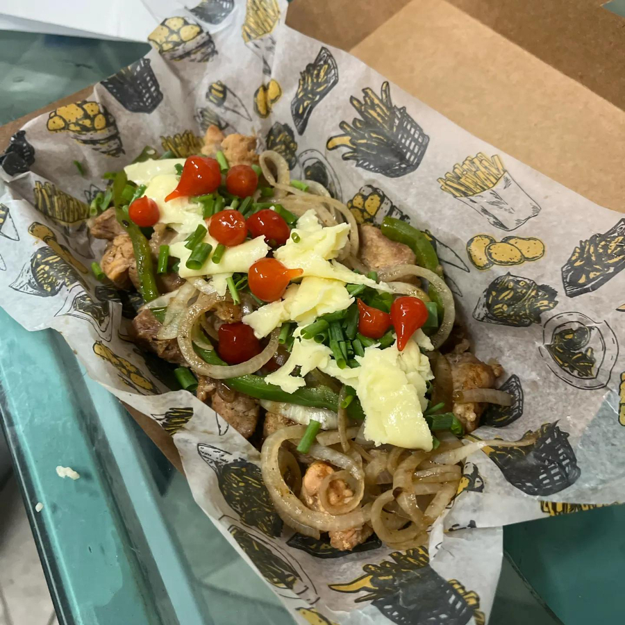 Pernil em tiras acompanhado de cebola,pimentão e cebolinha + porcao de batata frita com mussarela (800gr)