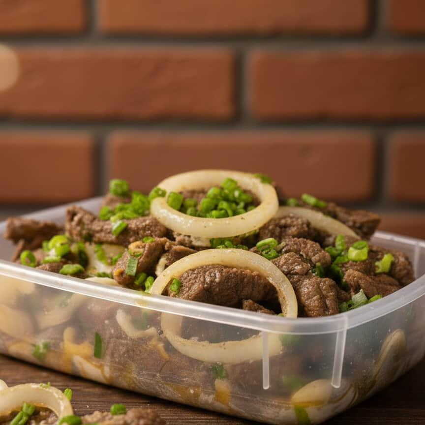 Tiras suculentas de pernil grelhadas na chapa com cebola e pimentão