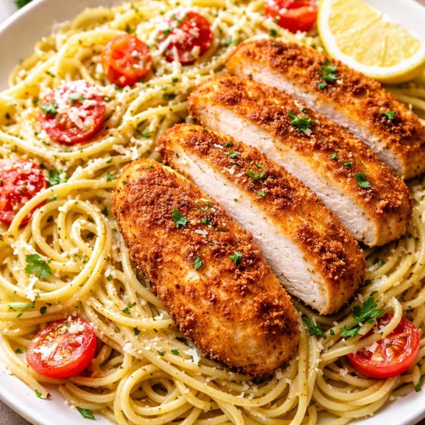 File De Frango Empanado Com Espaguete