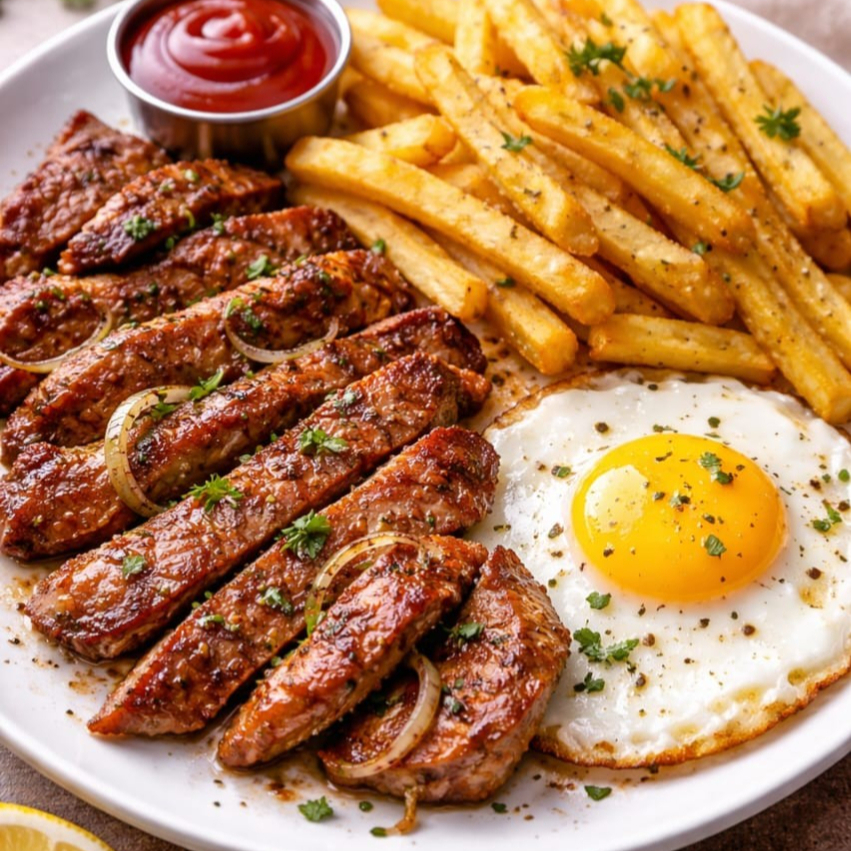 Acompanha: Arroz, Feijão, Batata frita, Bife de Boi e Salada