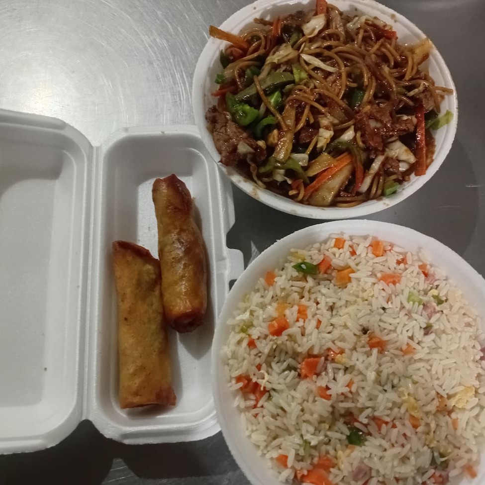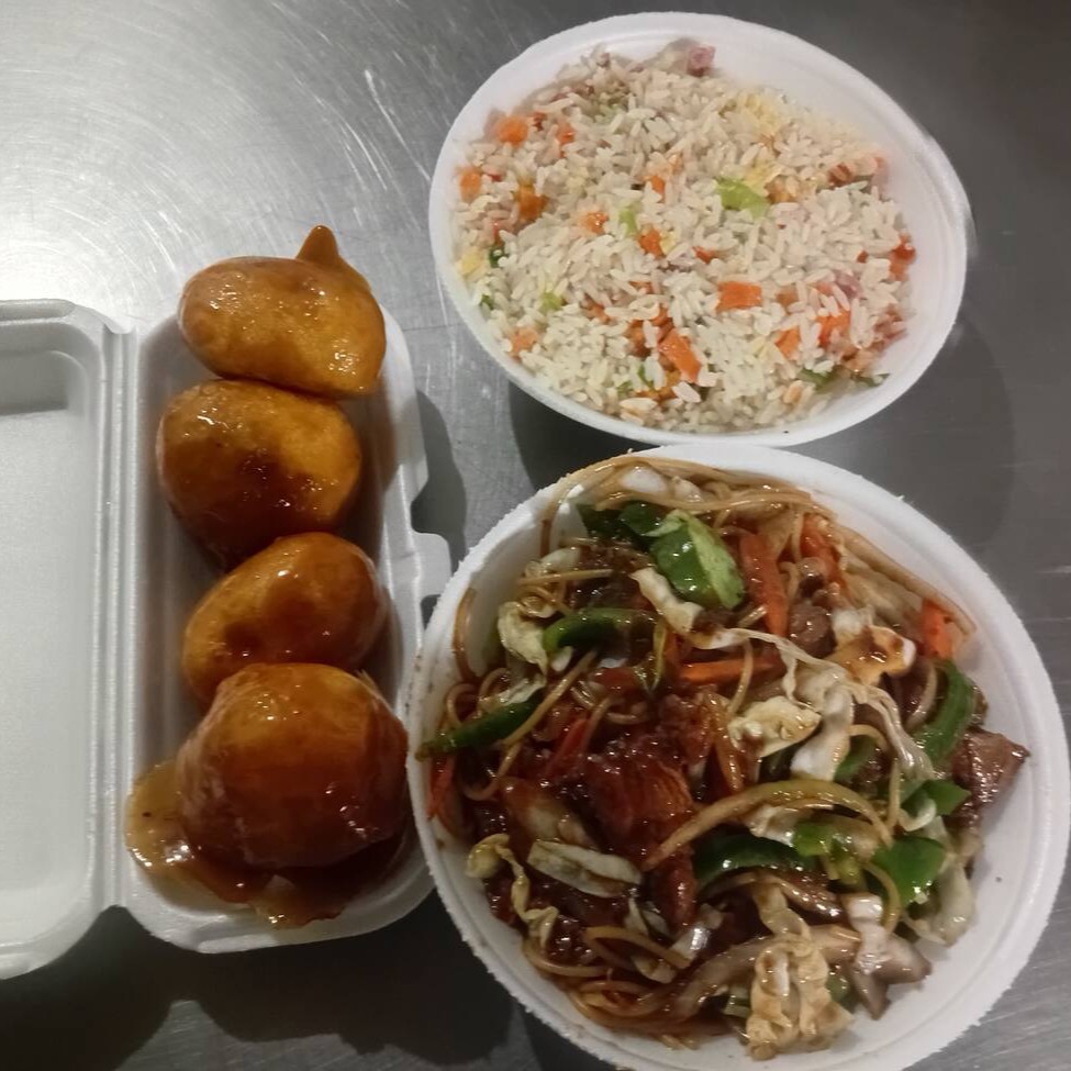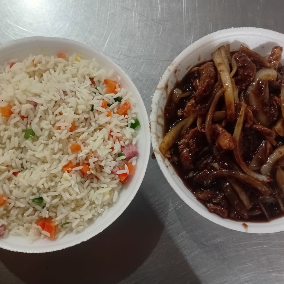 Filé de boi, cenoura, cebola, pimentão, brócolis e repolho regados ao delicioso molho chinês especial + arroz yakimeshi com presunto, cenoura, cebolinha e ovos mexidos. serve 1 pessoa.