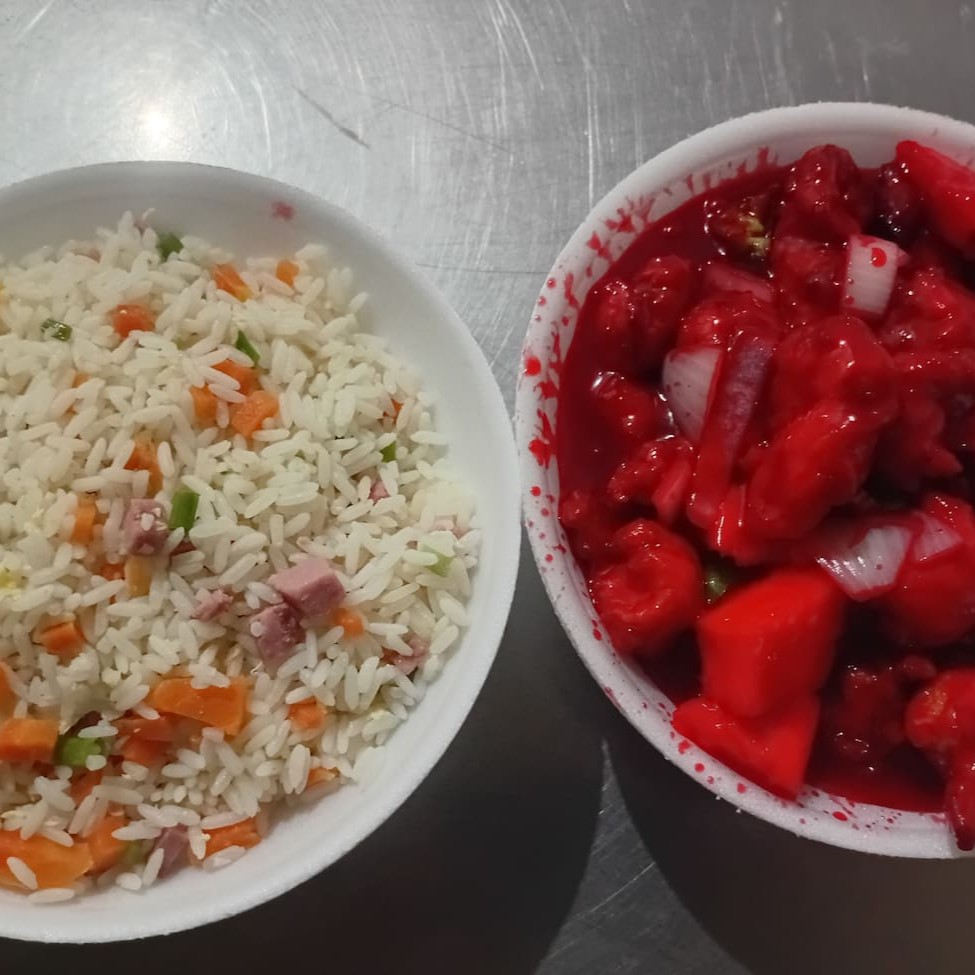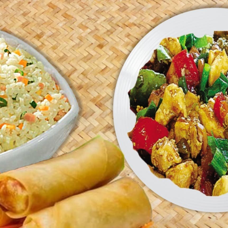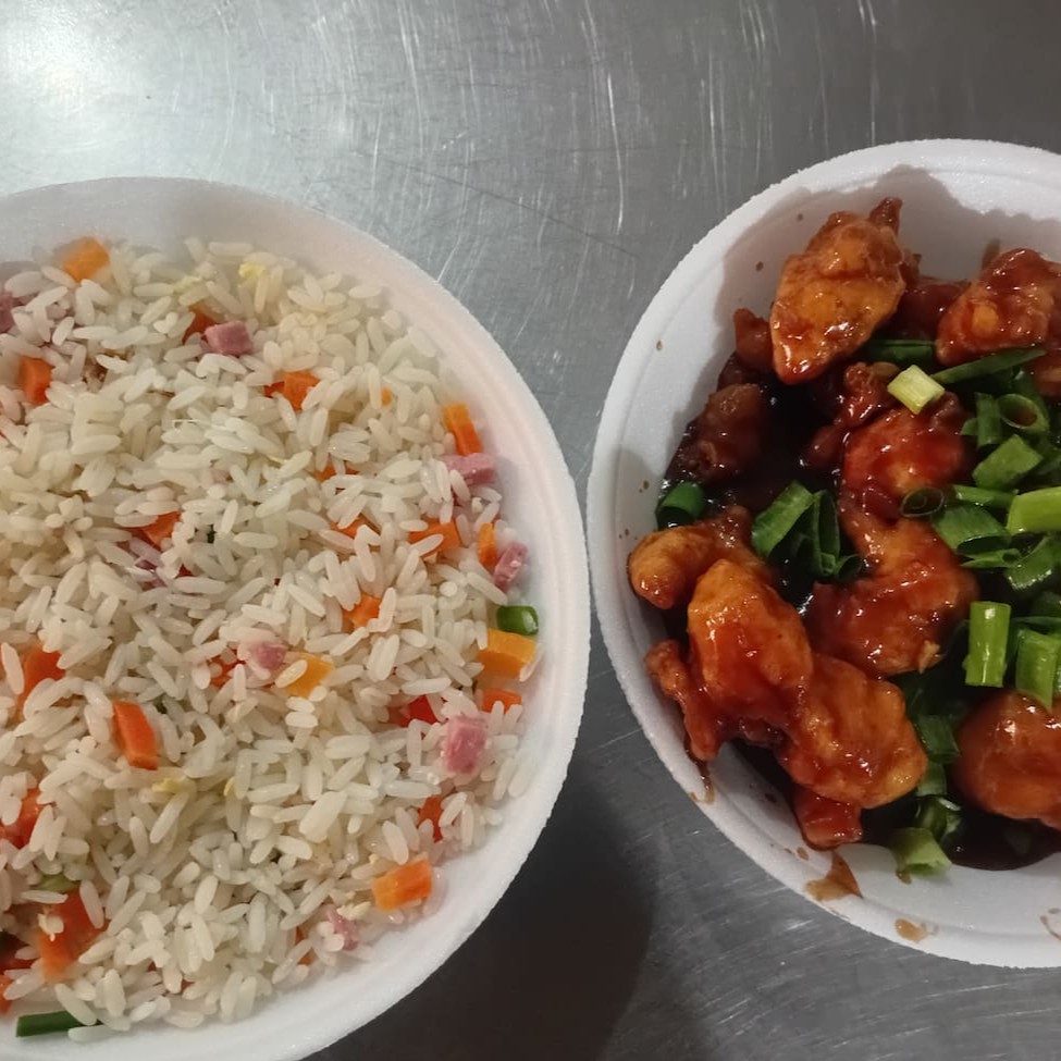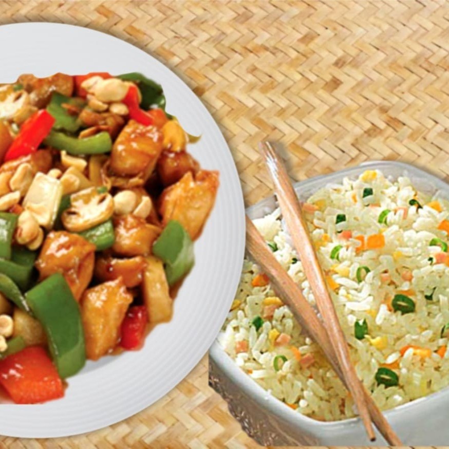 Filé de frango, cebola, pimentão, cenoura e repolho, regados ao delicioso molho chinês especial + Aroz Yakimeshi com presunto cenoura, cebolinha, ovos mexidos. Serve 2 pessoas.