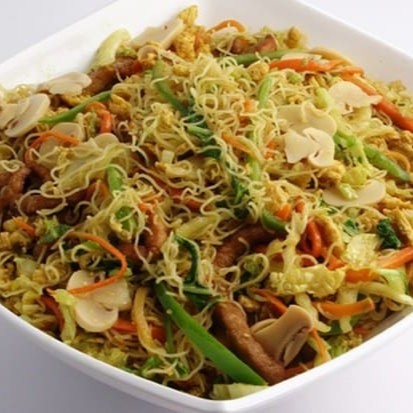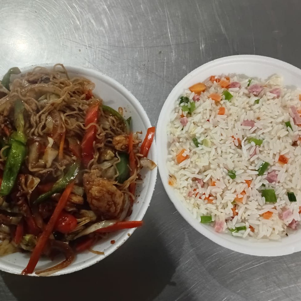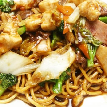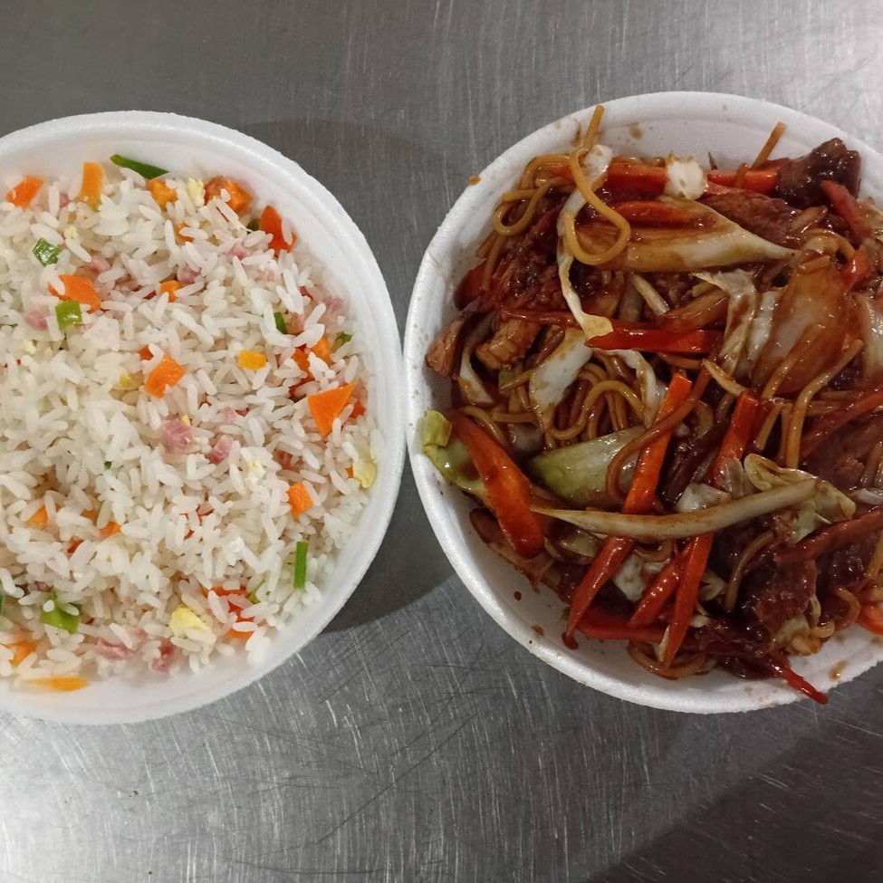 Macarrão, filé de frango, file de boi, camarão, pimentão, cenoura, cebola, repolho e brócolis regados ao delicioso molho chinês especial. Serve 2 pessoas.