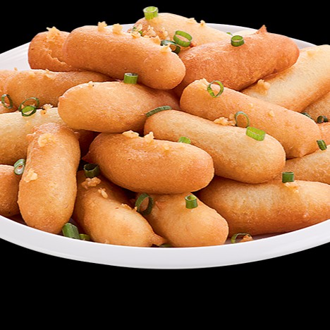File de frango empanado em fina massa à moda chinesa, cebolinha. Serve 2 pessoas.