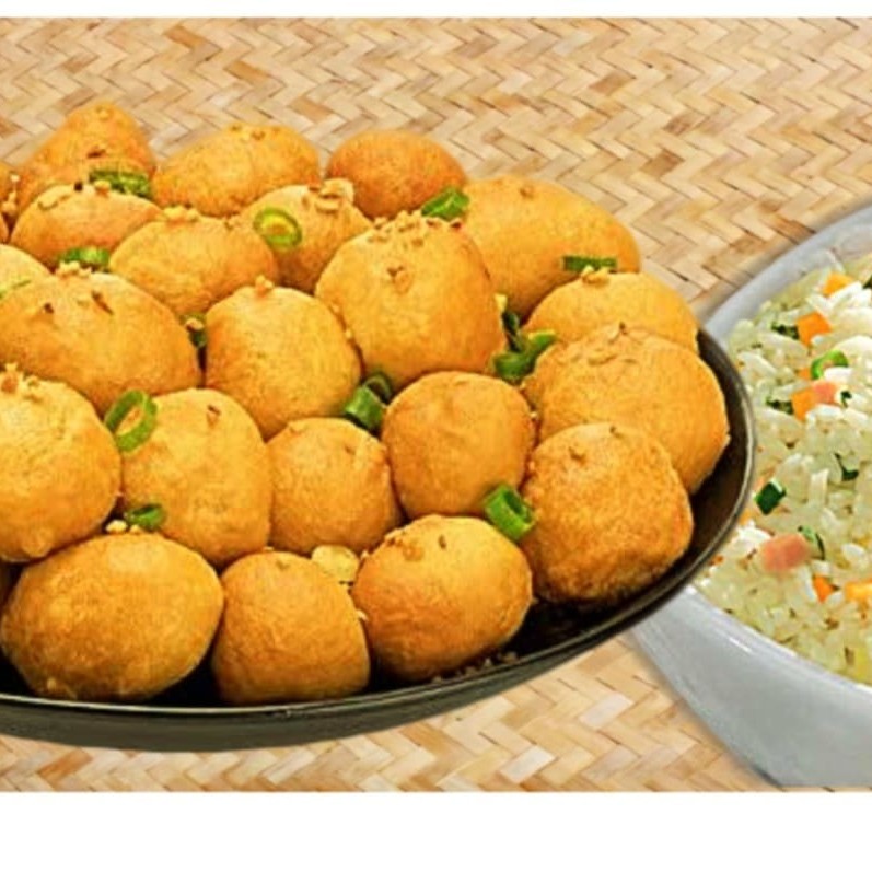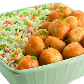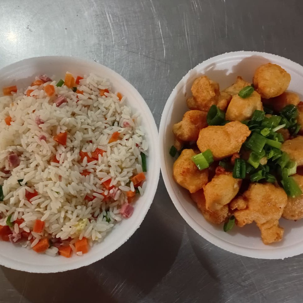 Filé de frango empanado em fina massa chinesa especial, cebolinha, com delicioso tempero chinês especial + Arroz Yakimeshi com presunto, cenoura, cebolinha e ovos mexidos. Serve 1 pessoa.