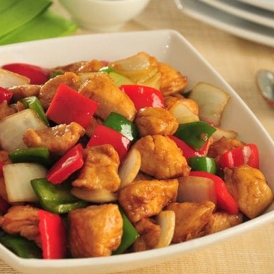 Filé de frango, pimentão, cebola, cenoura, repolho, regados ao delicioso molho chinês especial. serve 2 pessoas.