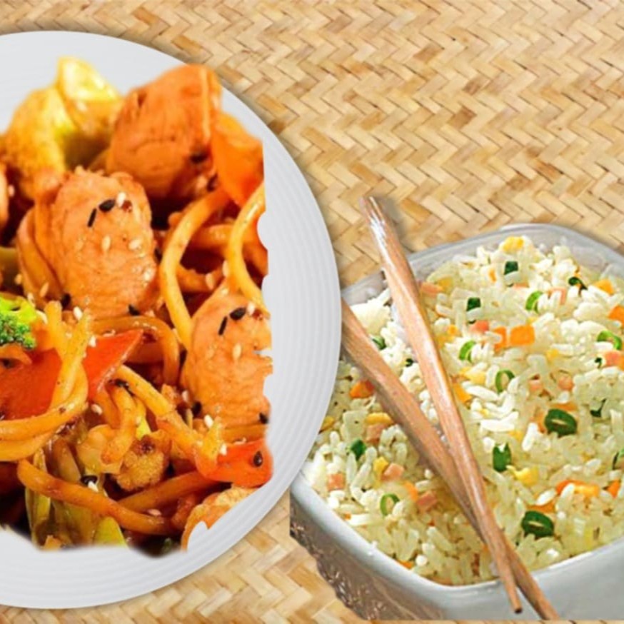 Macarrão, filé de frango, cenoura, cebola, pimentão, brócolis e repolho regados ao delicioso molho chinês especial + Arroz Yakimeshi com presunto, cenoura, cebolinha e ovos mexidos. Serve 2 pessoas. Promocao
