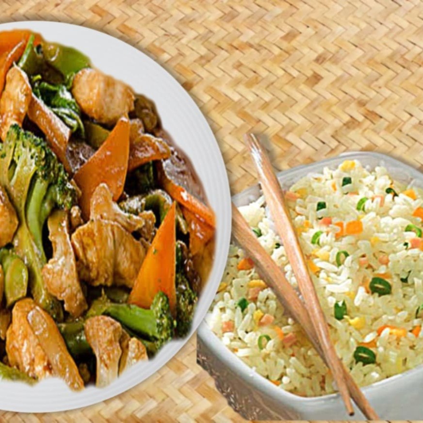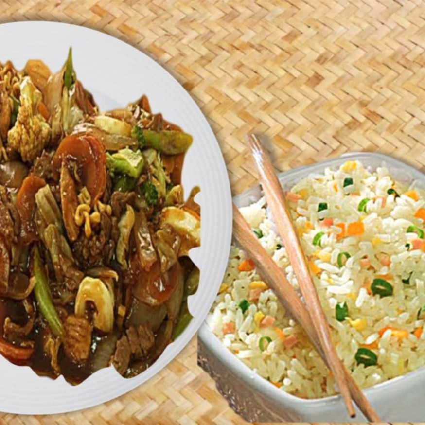 Filé de boi, cenoura, cebola, pimentão, brócolis e repolho regados ao delicioso molho chinês especial + arroz yakimeshi com presunto, cenoura, cebolinha e ovos mexidos. serve 2 pessoas. Promocao