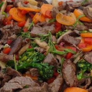 Bifum de filé de boi, cenoura,brócolis, cebola, pimentão, repolho, regados ao delicioso molho chinês especial. serve 2 pessoas.