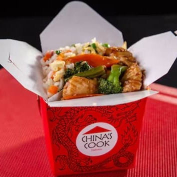 Uma refeição completa e equilibrada, com meia porção de arroz Chop-Suey e frango com legumes frescos. Perfeito para um almoço individual com sabor e qualidade únicos!