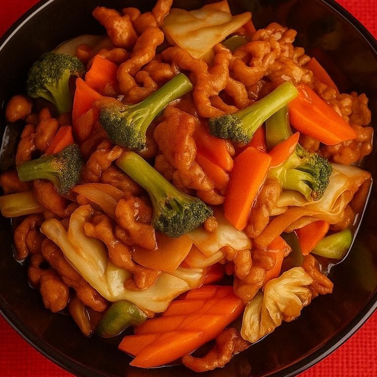 Carne macia e legumes salteados com um molho especial que combina doçura e sabor marcante.