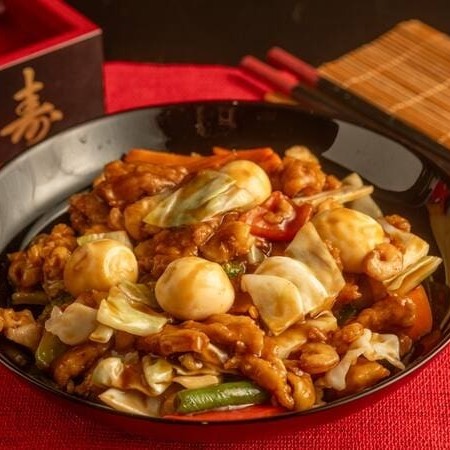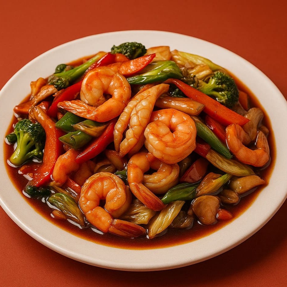 Camarões frescos salteados com legumes crocantes e temperados com nosso exclusivo molho oriental.