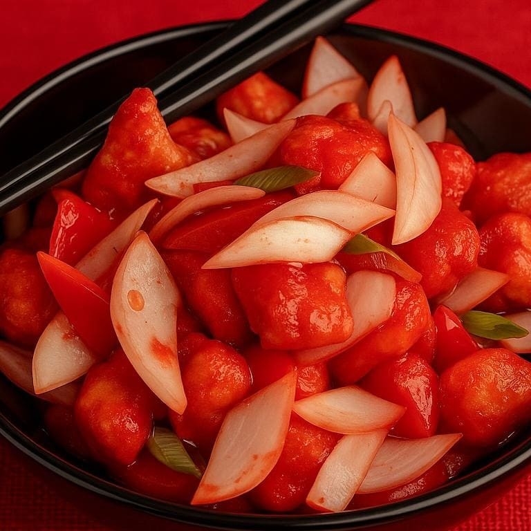 Cubos de frango salteados com pimentões e cebola, envolvidos em um molho agridoce irresistível.