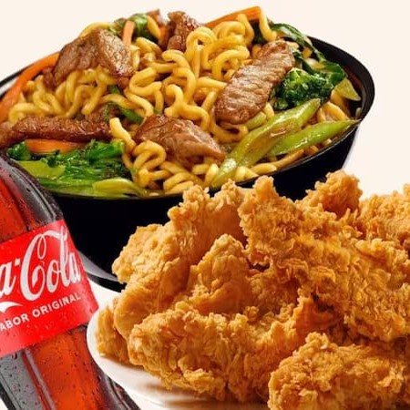 Um combo perfeito para compartilhar! Frango a passarinho crocante e bem temperado, acompanhado de um Yakissoba tamanho família G, cheio de legumes, carne e frango , macarrão chinês e um molho especial oriental. Para completar, uma Coca-Cola gelada de 2l.