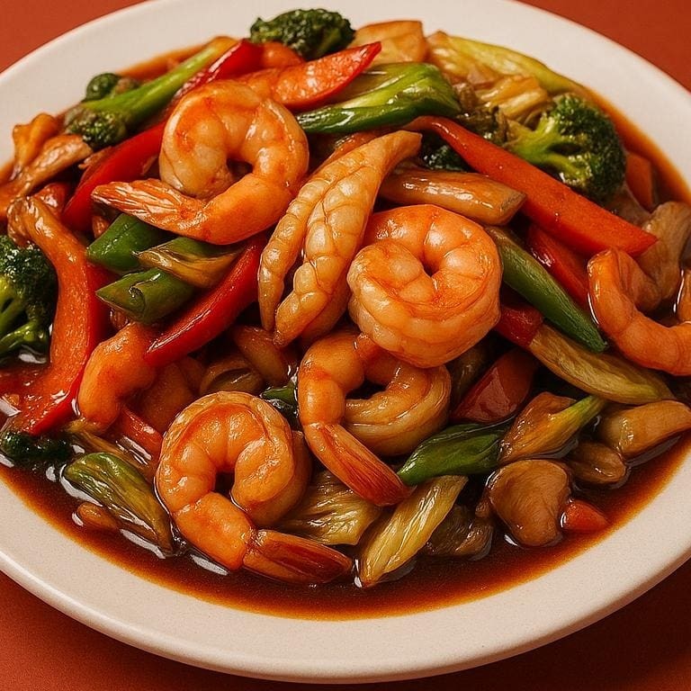 Camarões frescos salteados com legumes crocantes.