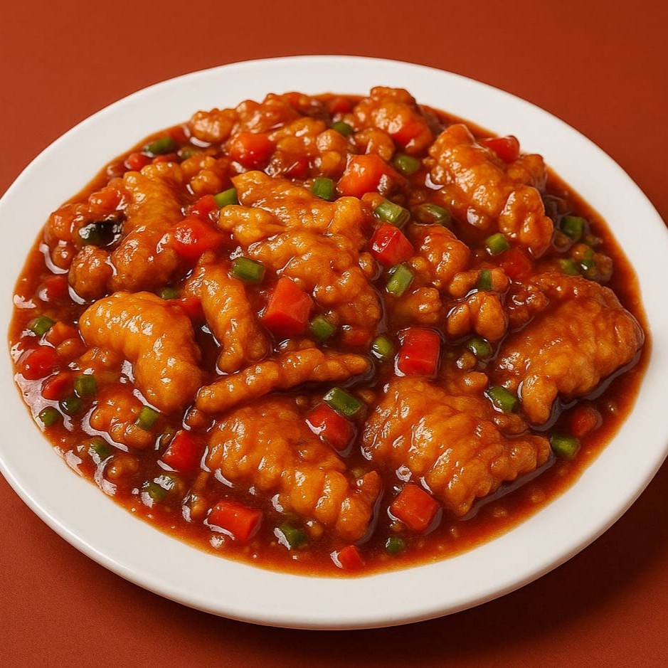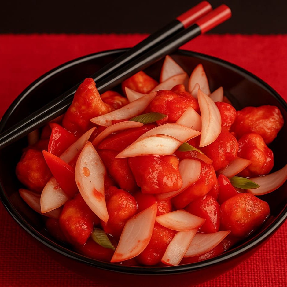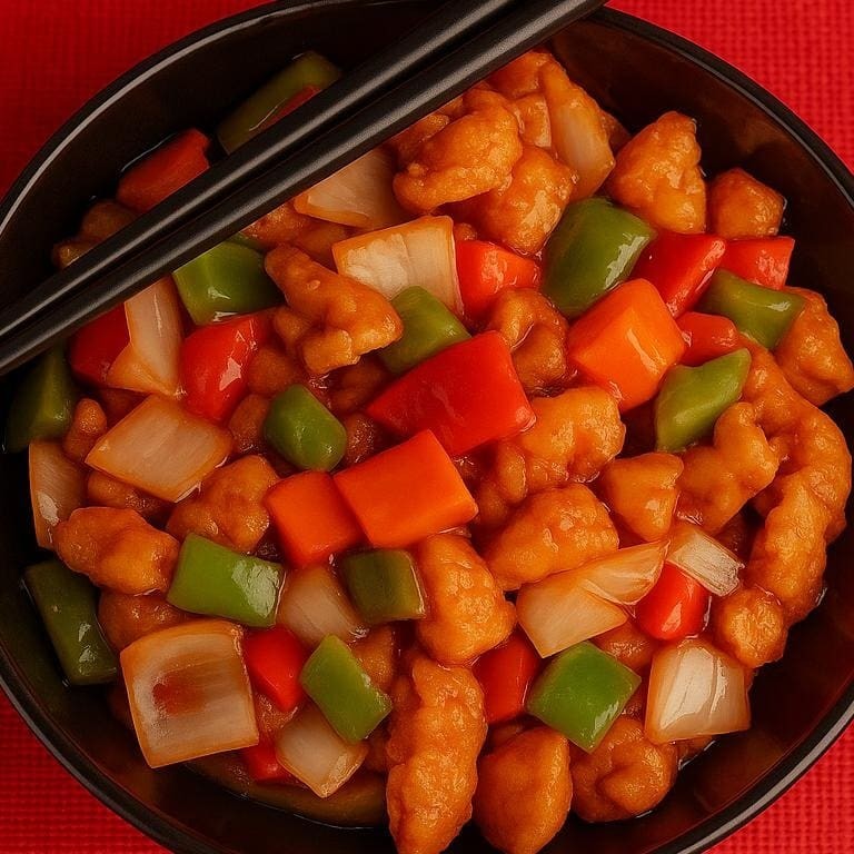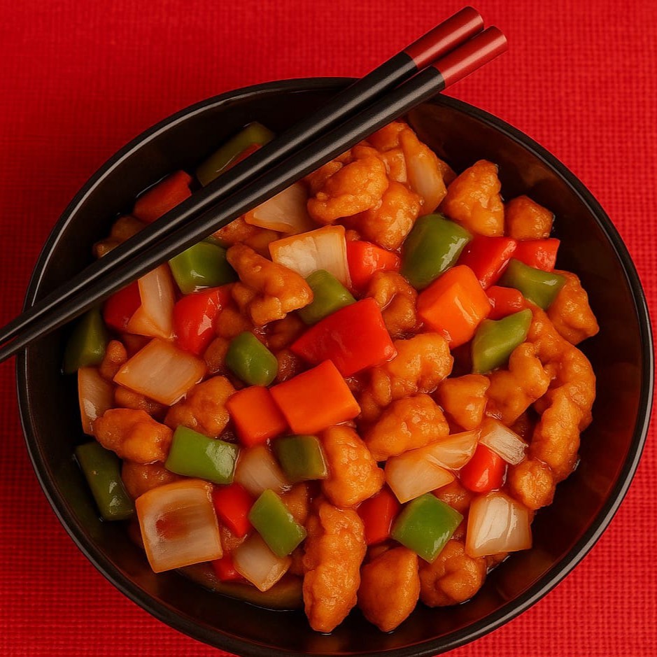 Cubos de frango salteados com pimentões e cebola, envolvidos em um molho agridoce irresistível.