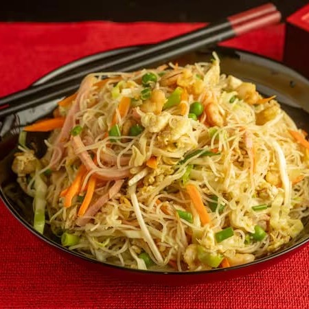 Macarrão de arroz fininho, salteado no wok com legumes crocantes e temperado com especiarias orientais.