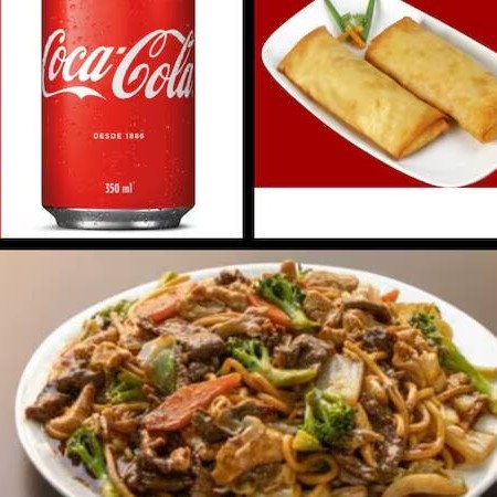 Macarrão com pedaços de carne ,frango legumes ao molho especial. E duas unidades de rolinho de primavera, mas uma coca lata 350ml