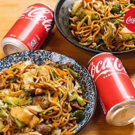 2 Yakisobas tradicionais (carne, frango e legumes) individuais acompanhados de duas Coca Colas lata 350ml