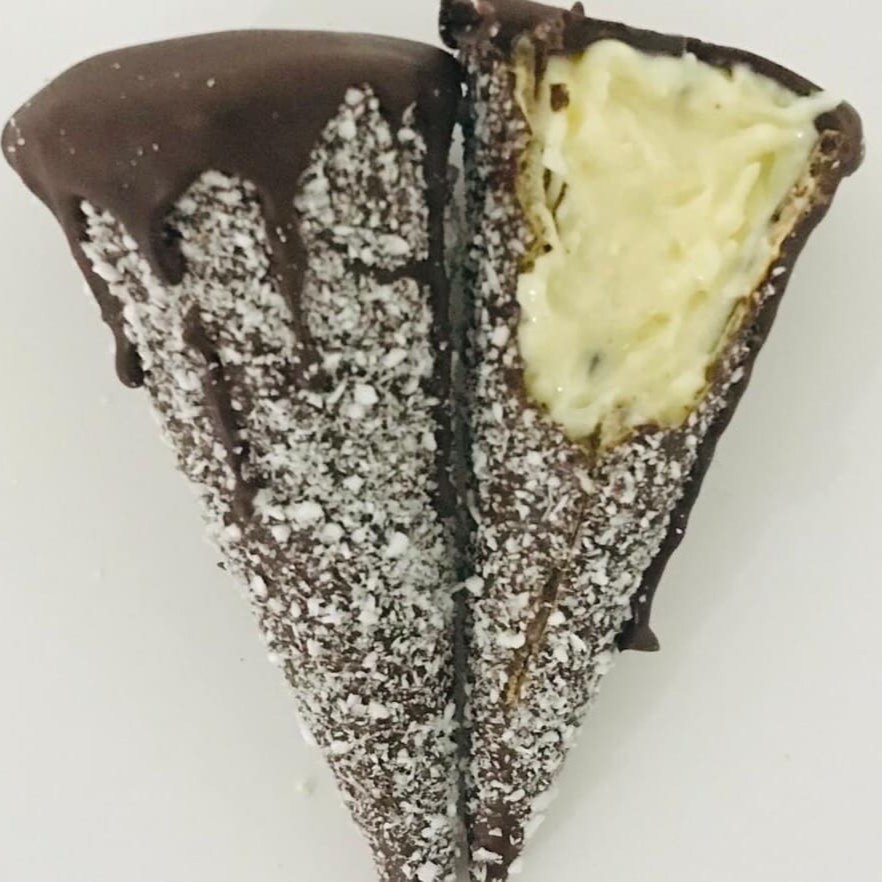 Cone trufado Prestigio, com delicioso recheio de creme belga com lascas de coco , com casquinha super crocante de chocolate meio amargo e coco ralado.