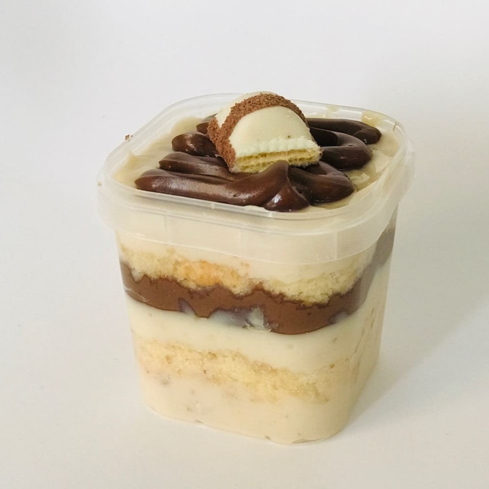 Bolo no pote Kinder Bueno , com massa branca de baunilha molhadinha , com delicioso recheio de creme Kinder Bueno com pedaços do bombom Kinder e Nutella pura .