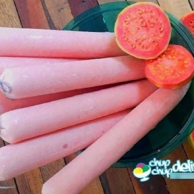 Goiabas batida com creme de leite e muito leite condensado, com pedaços de frutas