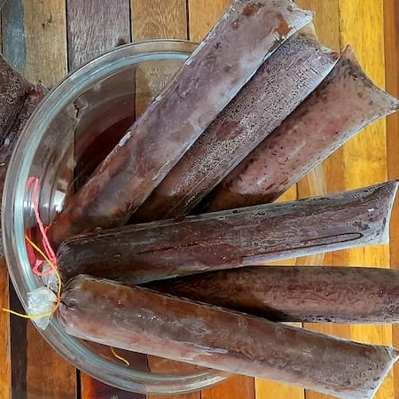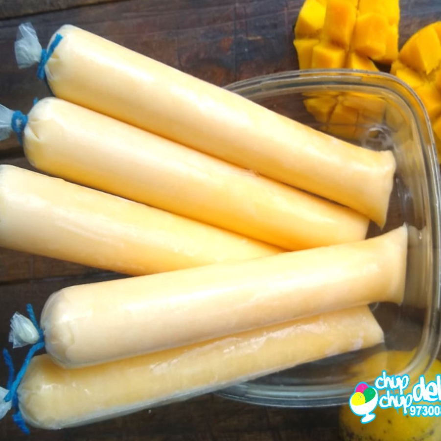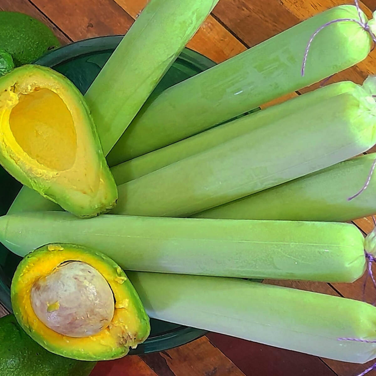 Coco Ralado batido com creme de leite e muito leite condensado e vários pedaços de frutas triturado em meio ao cremoso geladinho