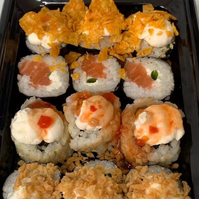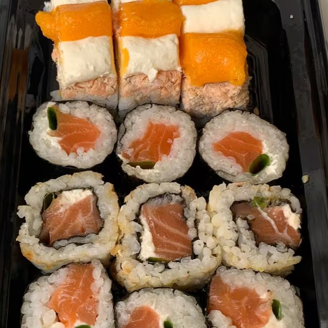 Este combiando vem com 12 pcs variadas, entre elas nosso delicioso maki filadelfia, ( salmao cream chesse e cebolinha, alem de outros como uramaki com Doritos. Acompanha 2 shoyo, 1 teriaki, e par de hashi.