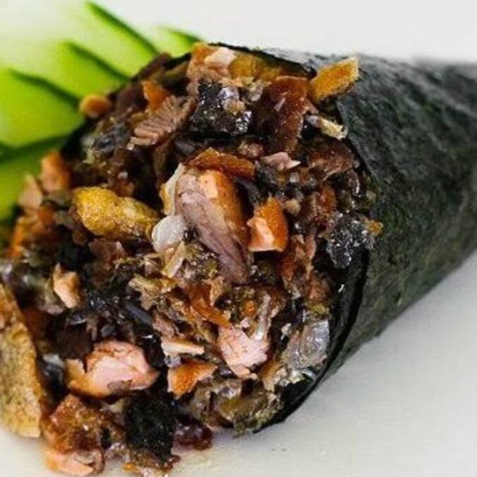 Esse nosso temaki skin ( pele de salmao grelhado) para os amantes de pele de salmao. Acompanha 1 shoyo, 1 teriaki, 1 par de hashi