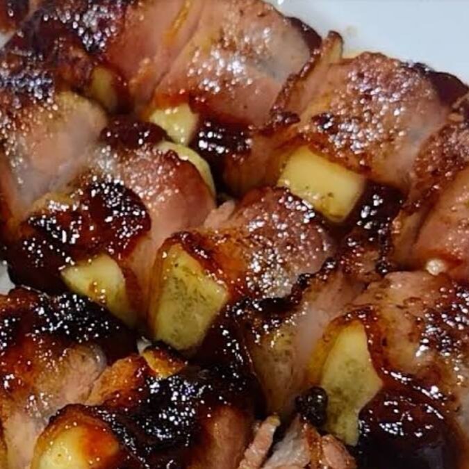 Esse espetinho tem queijo minas e goiabada envoltos com bacon, simplesmente sensacional.