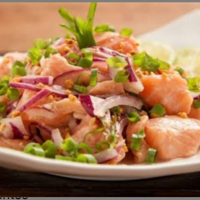Nosso Ceviche de salmao e feito com salmao frequinho, suco de limao, cebola roxa, lemon peper , tempero da casa.